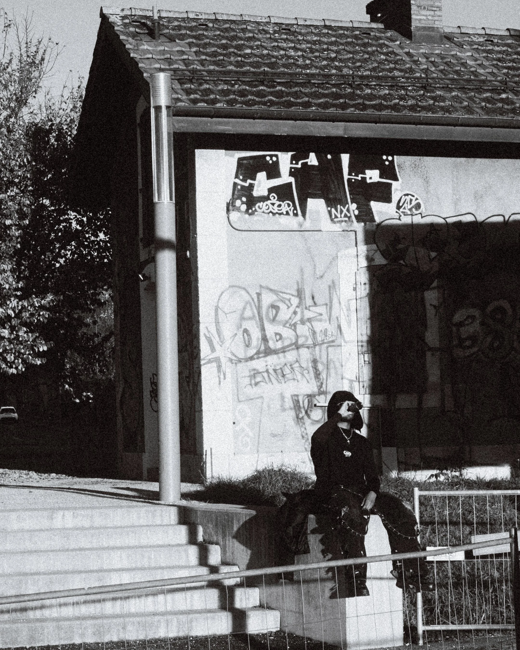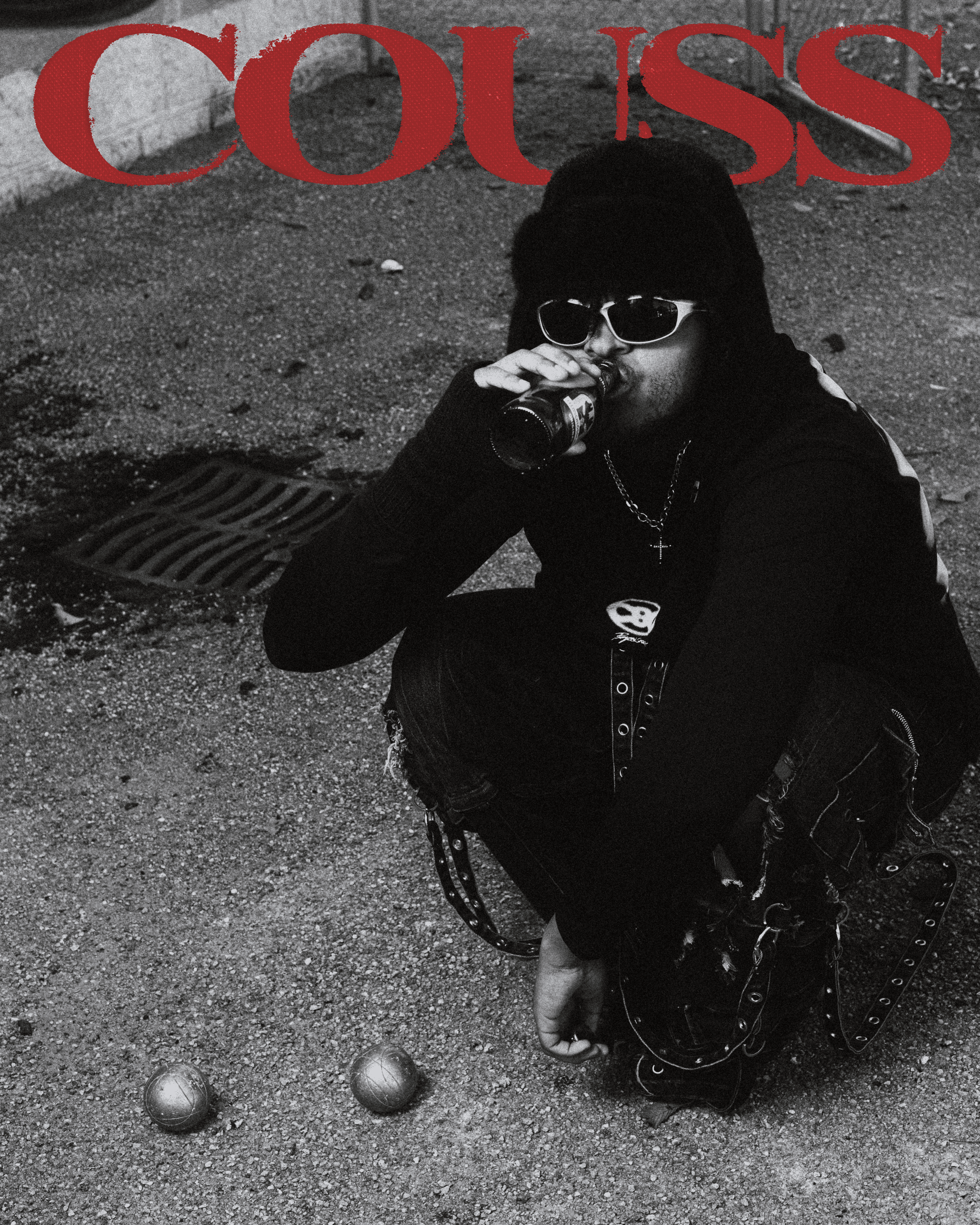 Un shoot en noir et blanc, brut et direct : le punk se frotte à la pétanque, l’attitude clash avec la tradition. Un contraste fort qui révèle toute la présence du modèle, magnifiquement à l’aise dans ce double univers.